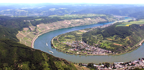 Die Rheinschleife von oben betrachtet mit Blick auf Filsen (rechte Rheinseite). Unten rechts sind Teile der Stadt Boppard zu sehen. Boppard ist weltweit bekannt unter dem Namen „Perle am Rhein“. Ob Römerkastell, Kirchen, Klosterbauten oder tolle Museen (z.B. Thonet Museum). Boppard muss man einfach besucht haben. Die bekannte Kur- und Weinstadt eignet sich, wie vielerorts entlang der Rheingoldstraße auch, hervorragend für einen Einkaufsbummel. Auf dem Bild links zu erkennen, die berühmte Weinbergslage „Bopparder Hamm“, die sich linksrheinisch kilometerlang bis nach Spay zieht. Viele Spitzenwinzerinnen und Spitzenwinzer zählt der Mittelrhein entlang der Rheingoldstraße von Trechtingshausen bis Rhens, darunter auch viele Winzerbetriebe von Boppard und Spay.