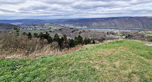 Viele Professoren weilen mit ihren Geologiestudenten im Rahmen von Tages-Expeditionen auf den Höhen der Rheingoldstraße, weil man hier die erdgeschichtlich bedeutsamen landschaftlichen Terrassenbildungen der Urzeit verdeutlichen und nachvollziehen kann. Das Foto zeigt ein Blick von der Höhe der Rheingoldstraße hinunter ins Tal nach Bad Salzig. Auf der anderen (rechten) Seite noch gut zu erkennen sind die „Feindlichen Brüder“ (Burg Sterrenberg und Burg Liebenstein).