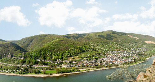 Blick auf Trechtingshausen von der gegenüberliegenden rechten Rheinseite. Besucher der Rheingoldstraße können in Trechtingshausen gleich zwei Burgen besichtigen, Rheinstein und Reichenstein. Hier tauchen Sie ein, in die Geschichte der Raubritter. Und ein Besuch der kleinen Gässchen des Weindorfes lohnt immer.